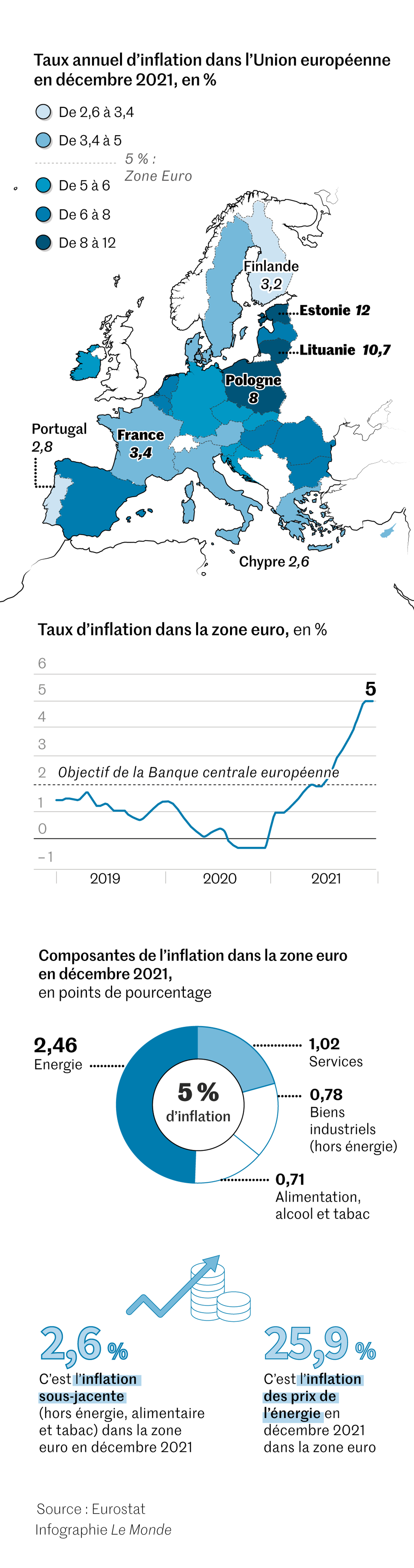 De la Pologne (8 % der Inflation im Dezember 2021) nach Irland (+ 5,7 %), neben Estland (+ 12 %) und Spanien (+ 6 %), teilweise nach Europa question du coût de la vie est de nouveau au cœur des préoccupations. Dans la zone euro, l’indice des prix a bondi de 5% en moyenne dans le dernier mois de 2021. Les menages voient désormais leur pouvoir d’achat s’éroder.
